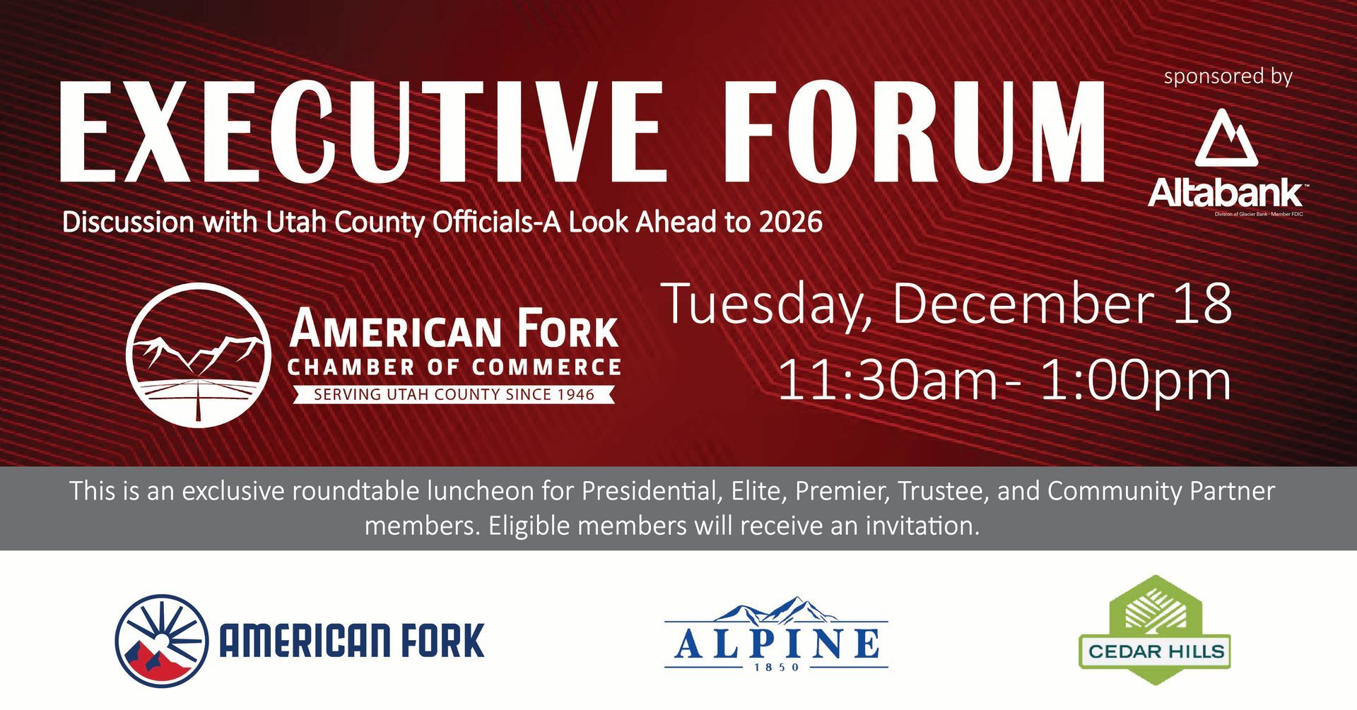 *The American Fork Chamber of Commerce’s Presidential, Elite, Premier, Trustee and Community Partner Level members are invited to participate in an exclusive roundtable meeting held six times per year with the mayors and city staff of American Fork, Alpine, Cedar Hills, and Highland as well as with local legislators to discuss issues affecting businesses and to provide an essential business voice to city, county, state, and federal leaders.