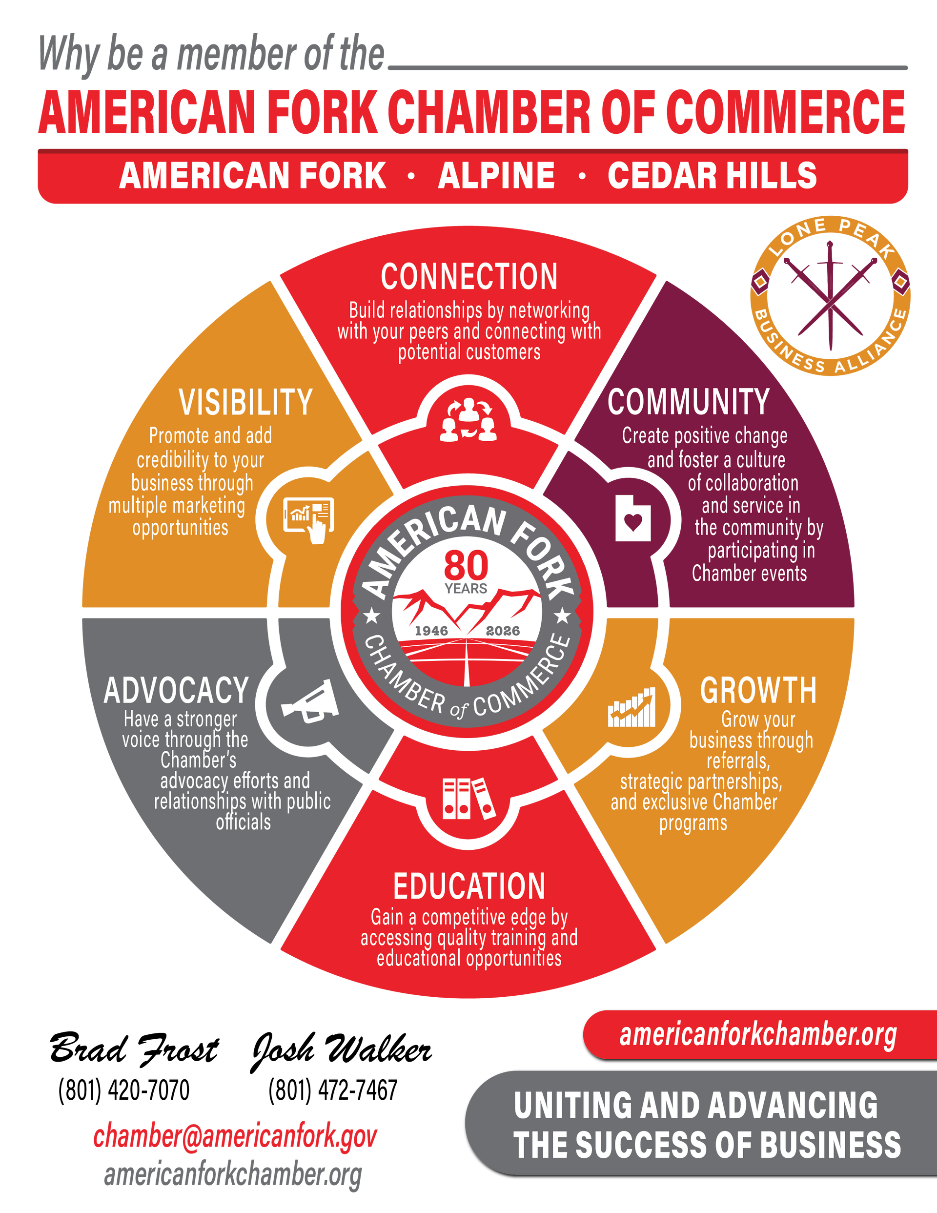 We serve the businesses of American Fork, Alpine, Cedar Hills, and Highland, Utah. We are proud to support our members and our community through monthly Chamber luncheons, networking events, the Utah County Business Summit, the Memorial Classic Golf Tournament, Halloween on Main, Holiday Magic at the Park, Steel Days and more.
