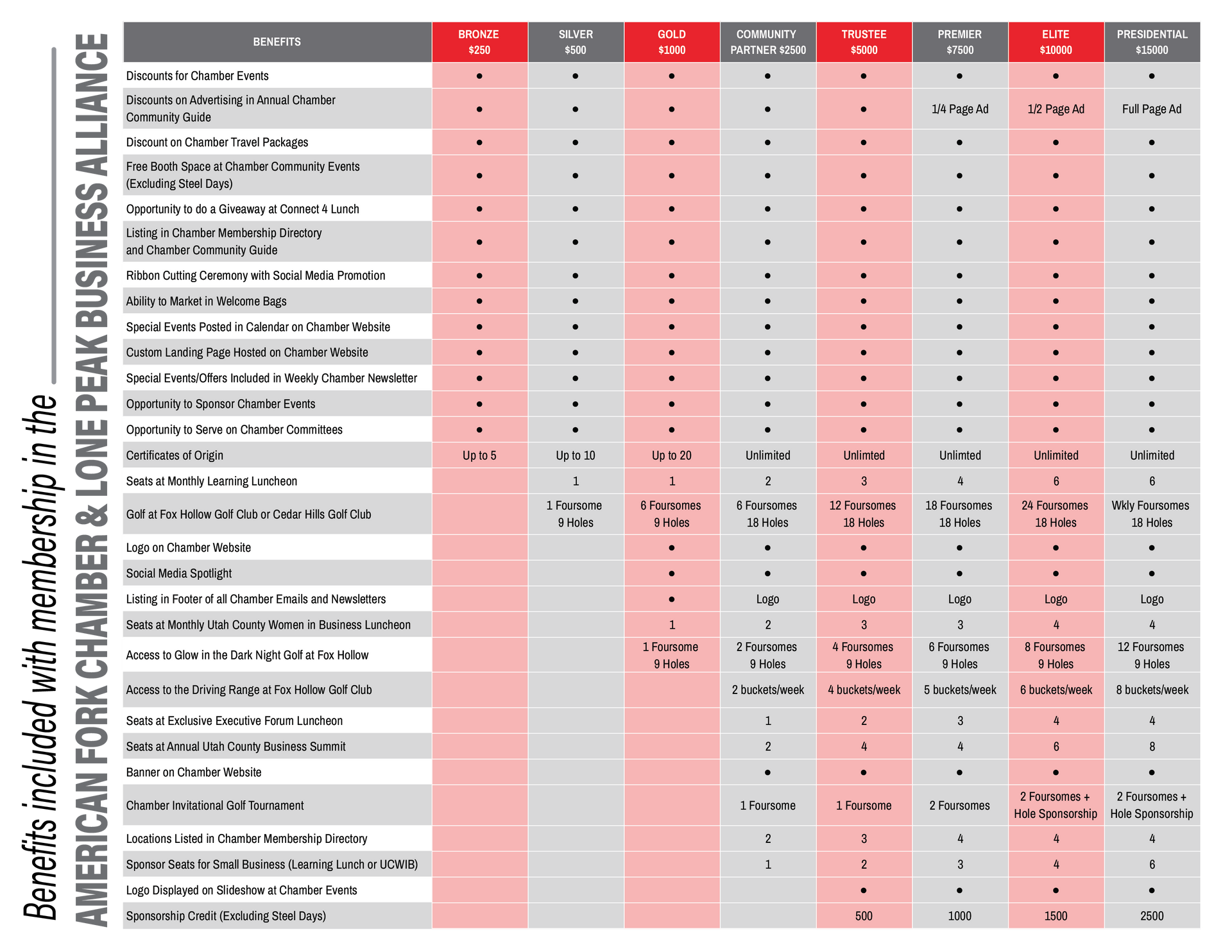 We currently offer nine levels of membership: Presidential, Elite, Premier, Trustee, Community Partner, Gold, Silver, Bronze, and Home-Based. Each has varying costs and benefits associated with it. From networking opportunities to grow your business to educational forums to expand your knowledge and ideas, the Chamber seeks to be your business partner in promoting your success!